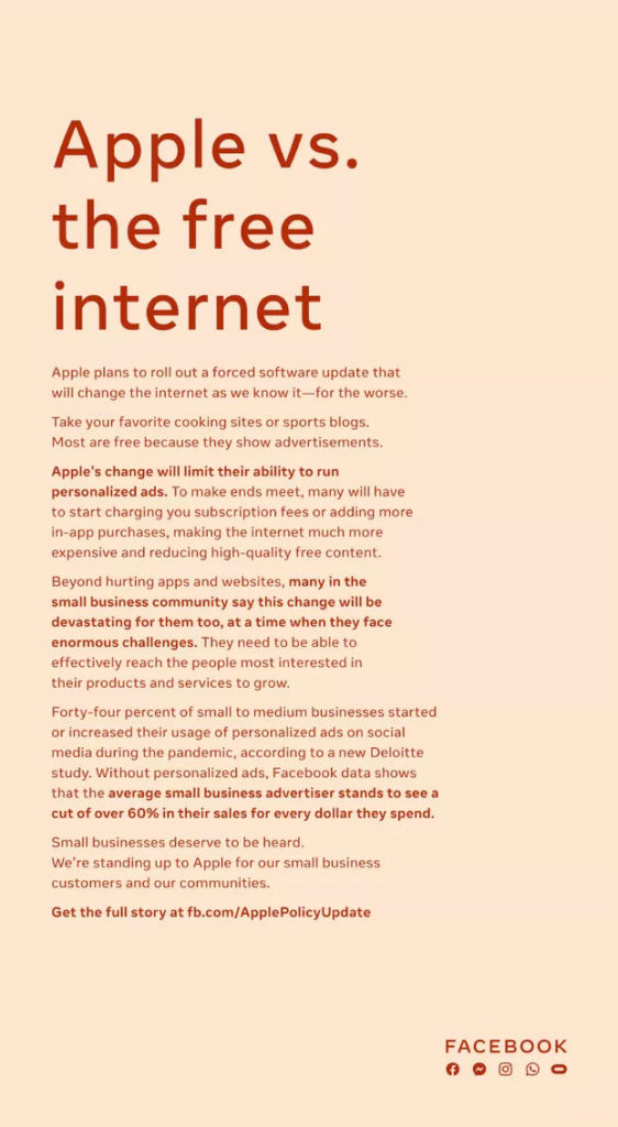 Facebook came out with a direct response publicly and launched Press Releases and Ads in Publications, positioning themselves as a small business advocate and criticizing Apple.