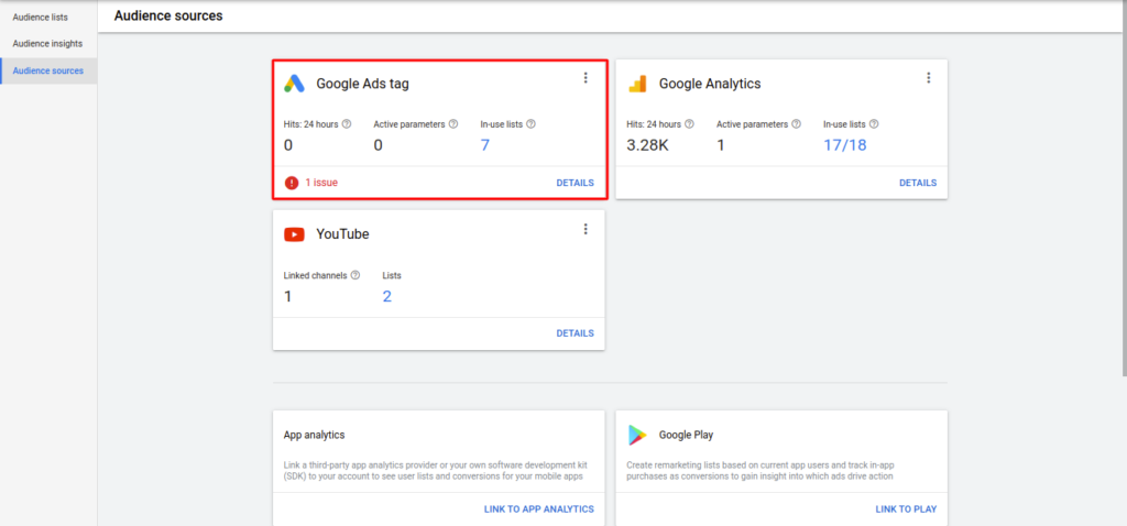 2. Check if your tag is active in the Google Ads account. It will show an error if there is no activity in the remarketing tag.